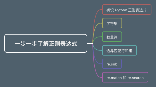 目录¶ 一步一步了解正则表达式 │ ├── 初识 Python 正则表达式 ├── 字符集 ├── 数量词 ├── 边界匹配符和组 ├── re.sub └── re.match 和 re.search